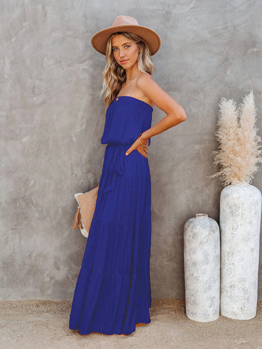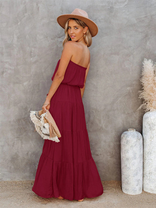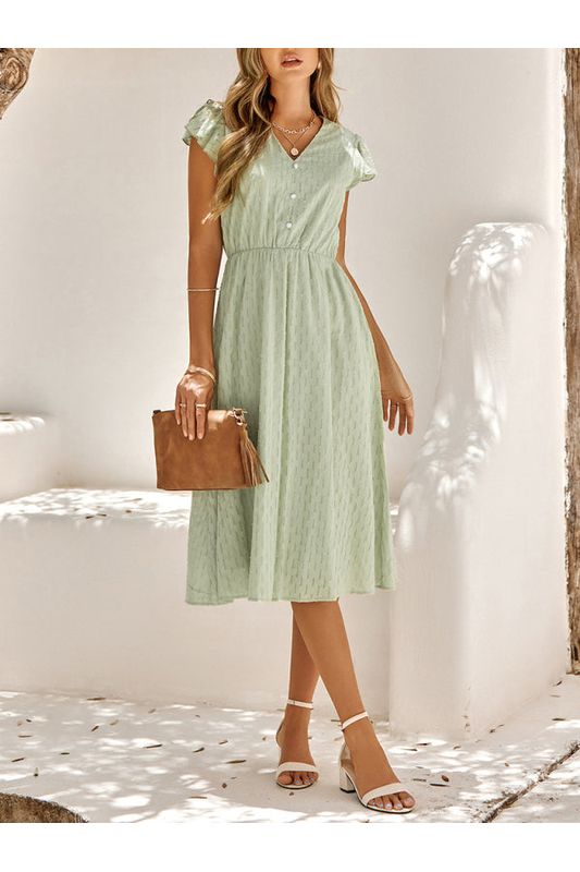 Ellla Wrinkle Breathable Loose Hem V-neck Short Sleeve Brown Solid Color Dress